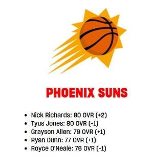 1月31日訊 NBA2K本周更新,太陽(yáng)隊(duì)內(nèi)球員的能力值有所變化,新援理查茲由78上漲至80。