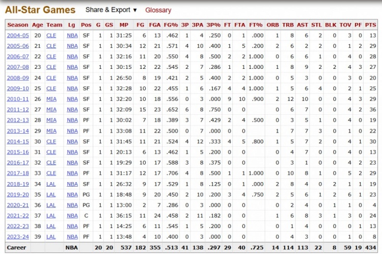 此前20次出戰(zhàn)全明星具體情況如下: