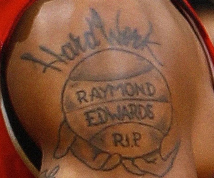 “如果我不打籃球的話,舅舅不會(huì)開(kāi)心的。同時(shí),我要承擔(dān)起責(zé)任,成為一家之主?!彼诩绨蛏衔牧艘粋€(gè)文身,在一雙祈禱的手上,刻著“努力工作”這幾個(gè)字,雙手握著一個(gè)籃球,籃球上寫(xiě)著,“雷蒙德-愛(ài)德華茲,RIP”,努力工作、祈禱和籃球,這是他和舅舅之間,最牢不可破的紐帶。