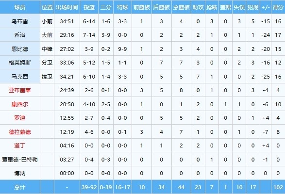 本場(chǎng)比賽喬治拿到球隊(duì)最高17分,馬克西和烏布雷拿到16分,恩比德拿到15分,格萊姆斯12分,康西爾10分。