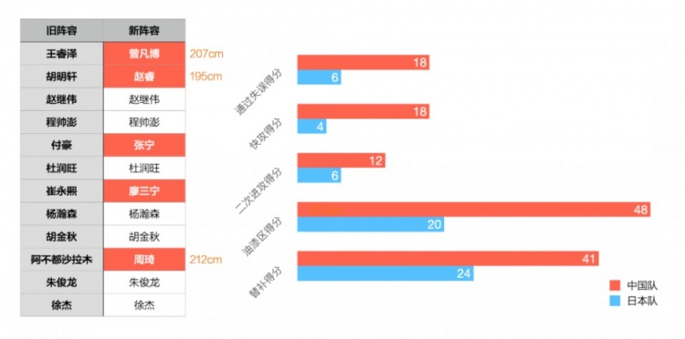 而與上一次亞預(yù)賽輸給日本隊(duì)相比,這次我們迎來(lái)了趙睿和周琦的回歸,并且多了2米07的高大鋒線曾凡博。正因?yàn)橛羞@些能在對(duì)位中占據(jù)絕對(duì)體型優(yōu)勢(shì)的球員加入,我們才有了這次42分的大勝。