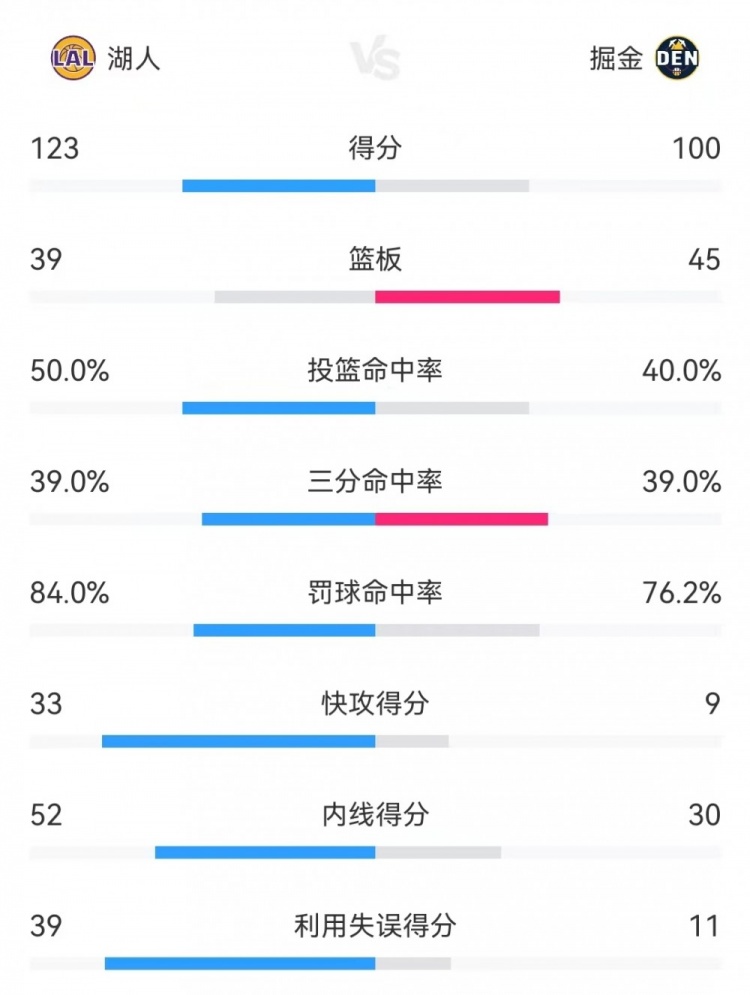 在利用對(duì)方失誤得分上,湖人也是39-11遙遙領(lǐng)先掘金。
