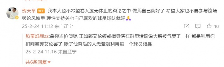 之后,賀天舉還在這條動(dòng)態(tài)的評論區(qū)寫道:“我本人也不希望卷入這無休止的輿論之中 做我自己就好了 希望大家也不要參與這場輿論風(fēng)波里 理性支持關(guān)心自己喜歡的球員球隊(duì)就好????”