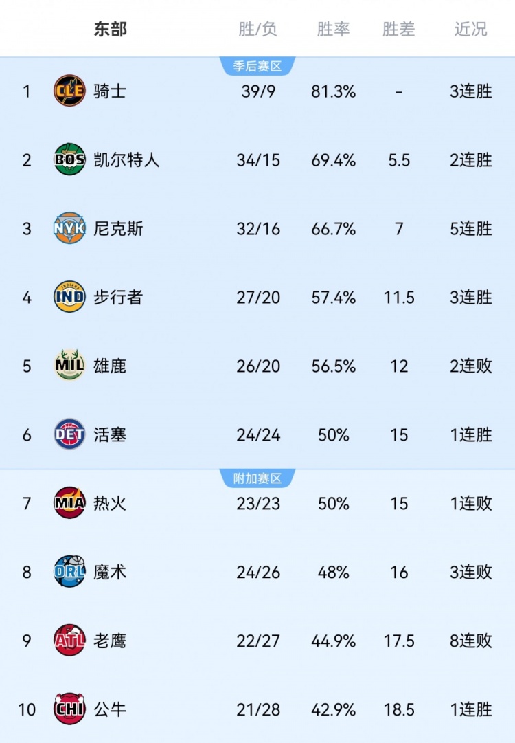 至此,步行者戰(zhàn)績(jī)來(lái)到了27勝20負(fù),近13場(chǎng)11勝。他們排名也超過(guò)了雄鹿升至東部第四。