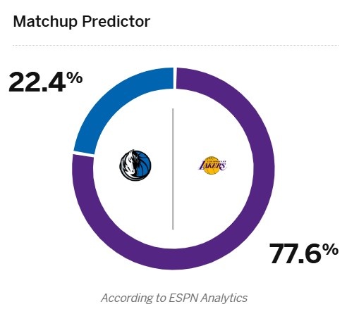 ESPN預測了本場比賽勝率,其中主場作戰(zhàn)的湖人勝率高達77.6%,獨行俠為22.4%。