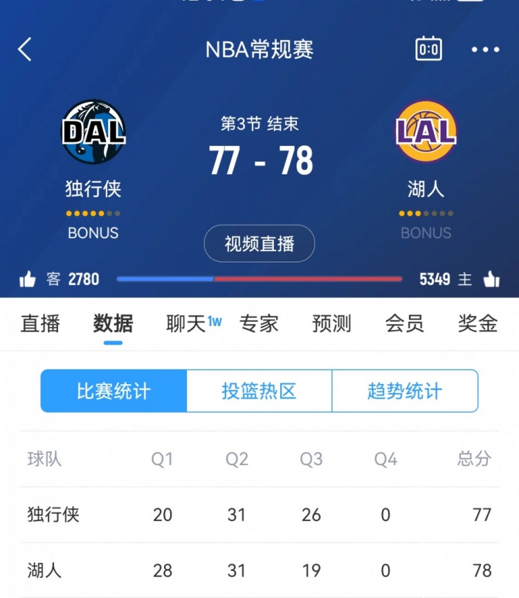 2月26日訊 NBA常規(guī)賽,獨(dú)行俠三節(jié)結(jié)束77-78落后湖人。
