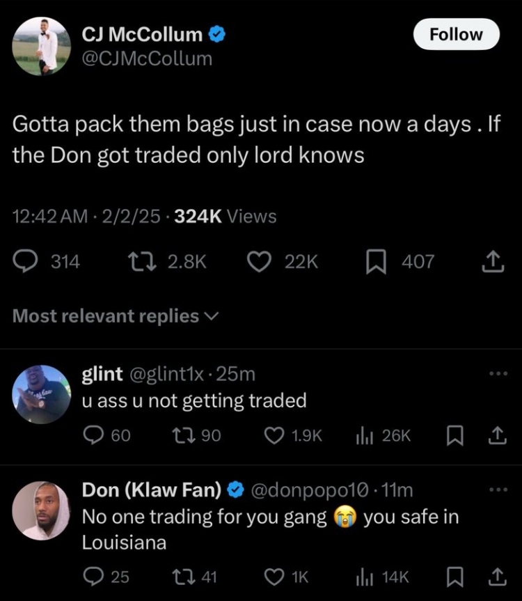 隨后,CJ-麥科勒姆更推道:“我得先把行李打包好,連東契奇都被交易了,天知道會(huì)發(fā)生什么?!?/p>
