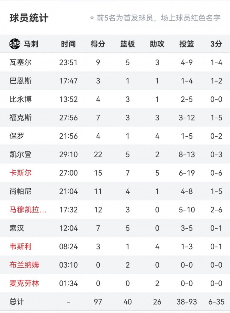 本場(chǎng)比賽,馬刺首發(fā)球員均表現(xiàn)低迷、沒有人得分上雙。具體如下: