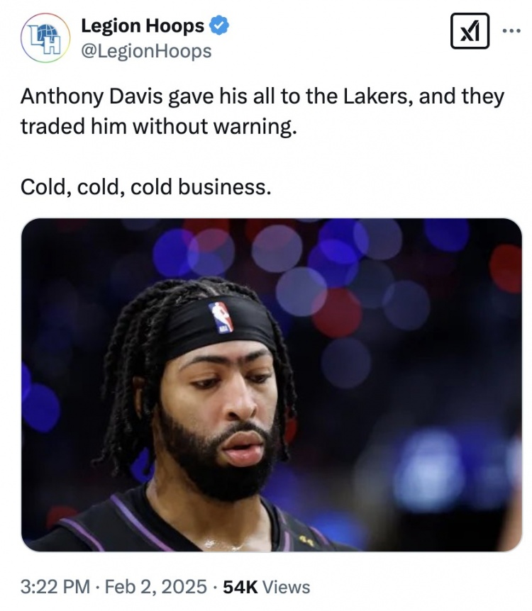 對此,美媒發(fā)推表示:“濃眉把一切都獻給了湖人,但他們卻毫無征兆地把他交易了。這筆交易太讓人心寒。”