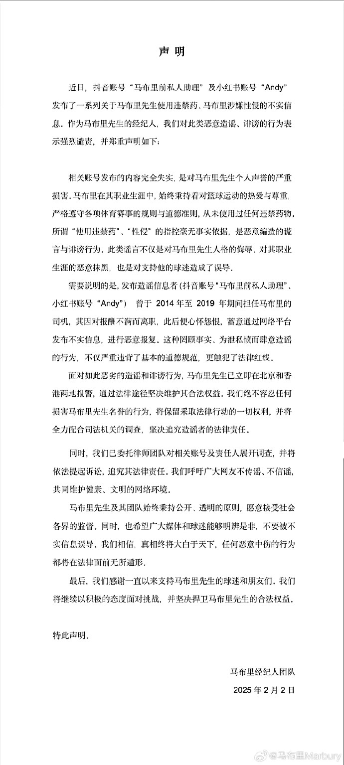 馬布里隨后通過個人微博發(fā)布了一篇其經紀人團隊撰寫的澄清信,證實了馬布里已報警的說法,并對“Andy”進行了強烈譴責,原文如下: