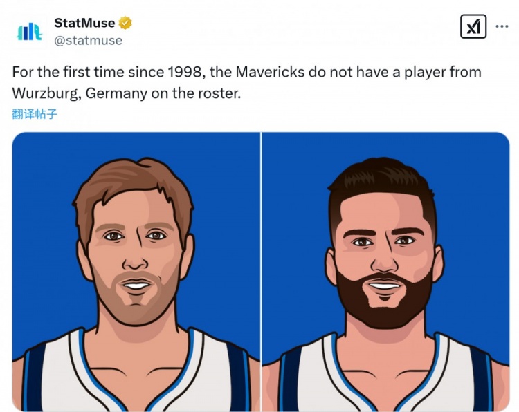美媒StatMuse:“這是1998年以來,獨(dú)行俠首次隊(duì)里沒有一名來自德國維爾茲堡的球員。(諾維茨基和克萊伯均來自此地)”