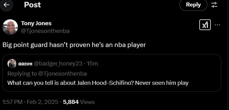 記者Tony Jones回復(fù)道:高大的控球后衛(wèi)(198cm)還未能證明自己具備NBA球員的實(shí)力。