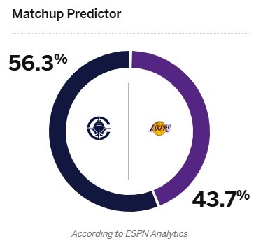 ESPN給出了本場(chǎng)比賽勝率預(yù)測(cè),其中5連勝的湖人為43.7%,快船為56.3%。