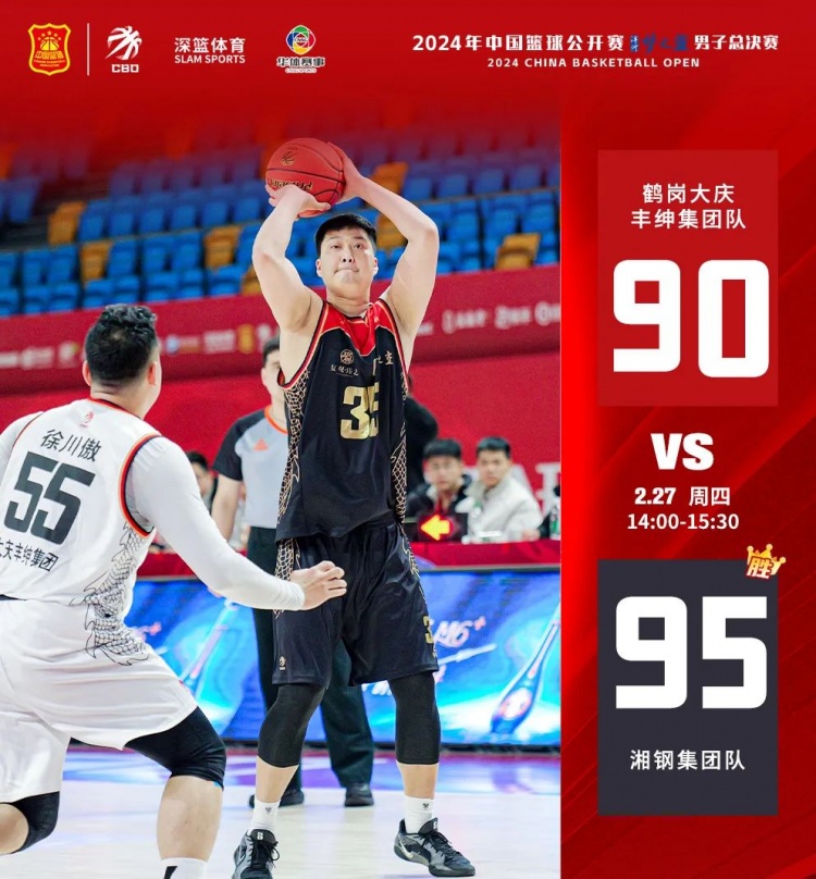 比賽開始,兩隊上來比較慢熱。隨后大慶豐紳集團(tuán)積極拼搶前后場籃板,牢牢把握籃下優(yōu)勢,率先取得領(lǐng)先。湘鋼集團(tuán)組織快攻,同時在外線穩(wěn)定輸出,緊咬比分。半場結(jié)束,大慶豐紳集團(tuán)48-46領(lǐng)先湘鋼集團(tuán)。下半場,兩隊打得依舊膠著。末節(jié)90平后,湘鋼集團(tuán)26號陳雙三分命中,2號達(dá)斯坦·哈爾恒搶斷后上籃得分,幫助湘鋼集團(tuán)95-90戰(zhàn)勝大慶豐紳集團(tuán)。