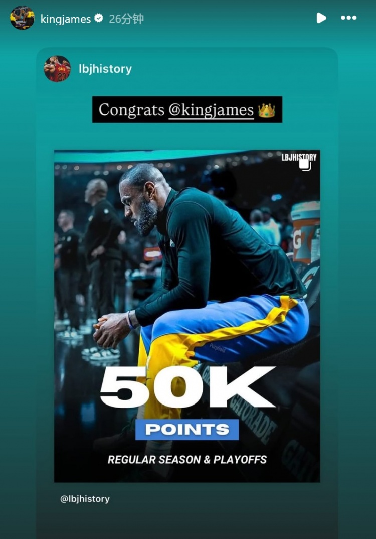 在本場比賽中,詹姆斯生涯總得分突破50000大關(guān);賽后,他轉(zhuǎn)發(fā)了眾多給自己送祝福的動態(tài)。