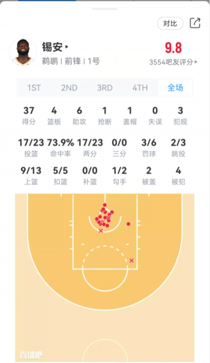 詹姆斯本場投籃熱圖