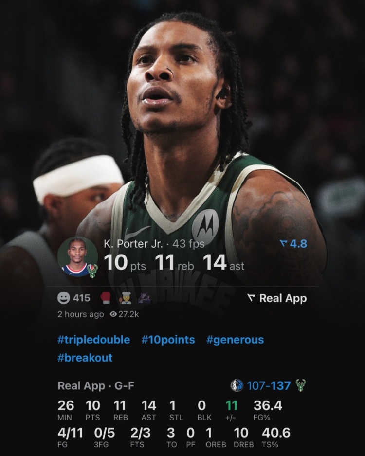 這是小凱文-波特加盟雄鹿后出戰(zhàn)的第10場(chǎng)比賽,他也成為隊(duì)史首位在加盟后前10場(chǎng)比賽中便拿下三雙的球員。