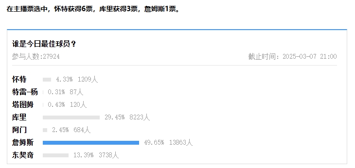 在主播票選中,懷特獲得6票,庫里獲得3票,詹姆斯1票。