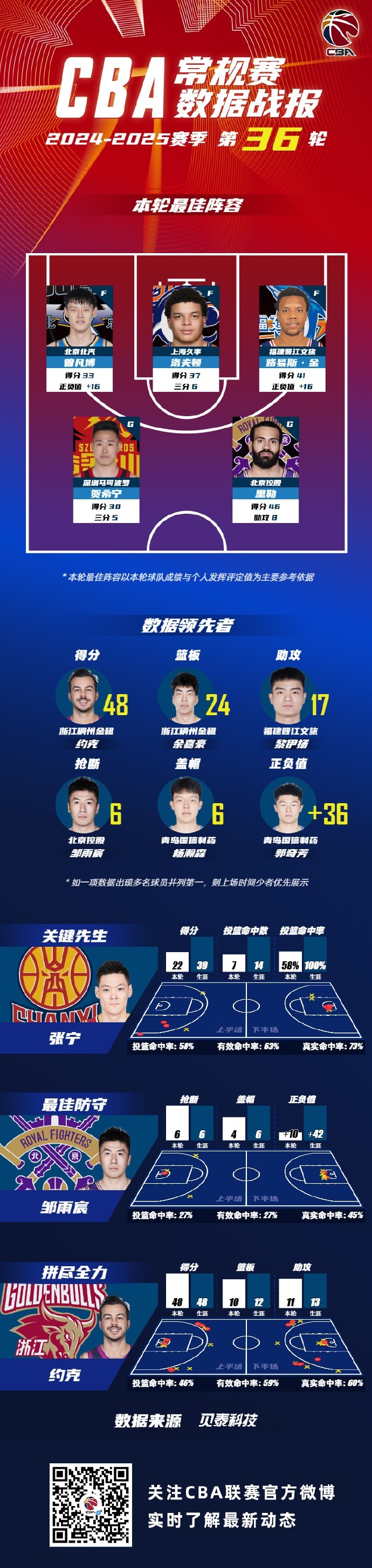 第36輪關鍵先生由來自山西汾酒職業(yè)籃球俱樂部張寧獲得;