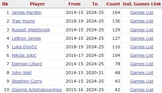 據(jù)統(tǒng)計,在過去10年里,哈登已經(jīng)165場比賽得到至少25分10助攻,同期所有球員中最多。