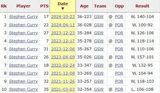 本場(chǎng)過后,庫里目前對(duì)開拓者10連勝,他上次輸給開拓者還是1469天前。