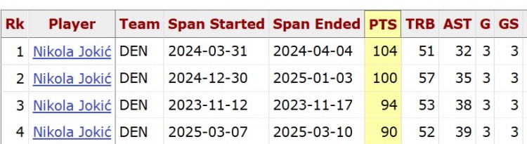 據(jù)統(tǒng)計,約基奇在連續(xù)3場比賽中至少得到90分50籃板30助攻,自聯(lián)盟合并以來唯一,而且他生涯已經(jīng)是第4次做到這一點(diǎn)。