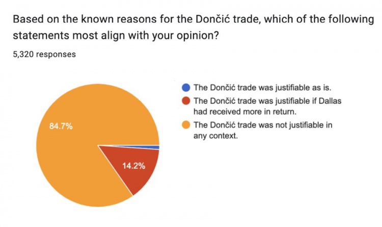 參與問卷調(diào)查的5320名球迷中,84.7%的球迷認為東契奇交易在任何情況下都說不過去,14.2%的球迷認為如果獨行俠獲得更多的回報,那么東契奇交易說得過去,認為東契奇交易說得過去的球迷只占1.1%。