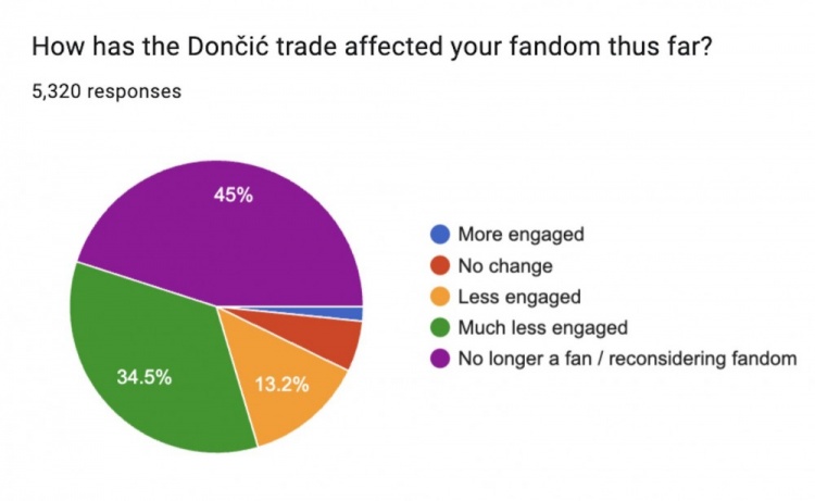 在東契奇交易如何影響你對球隊的喜愛這個問題上?45%的球迷表示不再是一名球迷或者要重新考慮自己的喜愛程度;34.5%表示自己現(xiàn)在參與度低多了,13.2%的球迷表示自己參與度略有降低,只有7.3%的球迷表示自己的喜愛度沒有變化或者參與度更高了。