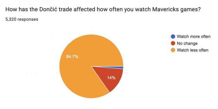 在東契奇交易如何影響你看獨行俠比賽這個問題上,84.7%的球迷表示已經(jīng)較少看獨行俠的比賽,14%的球迷表示沒有變化,只有1.3%的球迷表示自己看的更多了。