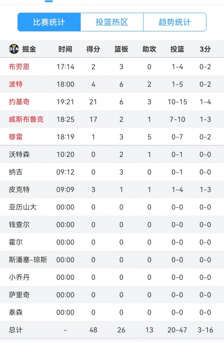 上半場(chǎng),掘金除約基奇和威少外均表現(xiàn)不佳,全隊(duì)半場(chǎng)47投20中,約基奇和威少25投17中,其他人合計(jì)22投僅3中,其中賈馬爾-穆雷個(gè)人7投0中。