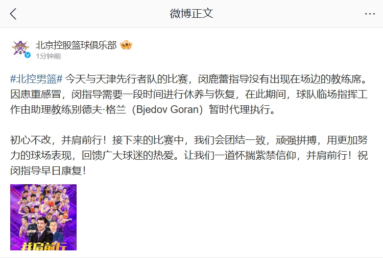03月15日訊 北控男籃官宣:因患重感冒,閔指導(dǎo)需要一段時(shí)間進(jìn)行休養(yǎng)與恢復(fù),在此期間,球隊(duì)臨場(chǎng)指揮工作由助理教練別德夫·格蘭(Bjedov Goran)暫時(shí)代理執(zhí)行。