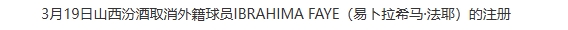 迪亞洛在3月15日對(duì)陣青島男籃的比賽吃到技術(shù)犯規(guī),累計(jì)9T自動(dòng)停賽一場(chǎng)。3月17日,山西取消注冊(cè)迪亞洛,注冊(cè)回法耶,法耶出戰(zhàn)了對(duì)陣福建男籃的比賽。