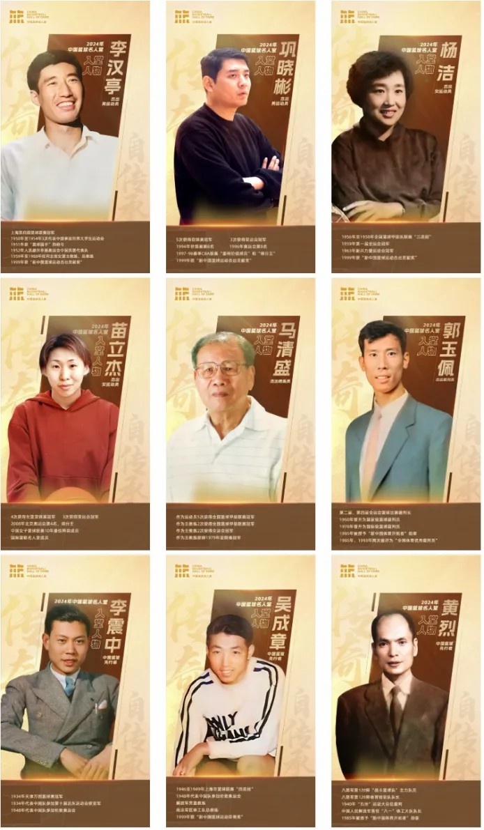 2024年中國籃球名人堂共產(chǎn)生9位入堂人物,杰出男運(yùn)動員為:李漢亭、鞏曉彬;杰出女運(yùn)動員為:楊潔、苗立杰;杰出教練員為:馬清盛;杰出裁判員為:郭玉佩;中國籃球先行者為:李震中、吳成章、黃烈。