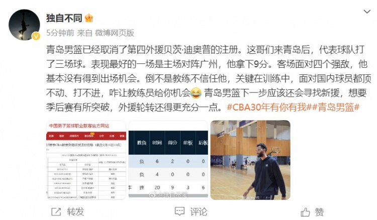 出戰(zhàn)3場&場均3.7分3板1.7助 CBA官方:青島男籃取消注冊迪奧普