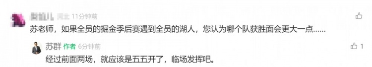 網(wǎng)友在蘇群公眾號(hào)評(píng)論區(qū)評(píng)論道:“蘇老師,如果全員的掘金季后賽遇到全員的湖人,您認(rèn)為哪個(gè)隊(duì)獲勝面會(huì)更大一點(diǎn)……”