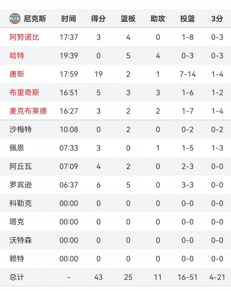 半場(chǎng)比賽,尼克斯首發(fā)除了唐斯以外都表現(xiàn)不佳,投籃共計(jì)24中3,共得到11分。
