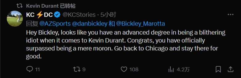 球迷三:嘿,看來你在"如何成為關(guān)于凱文-杜蘭特的胡說八道專家"這方面已經(jīng)獲得了高等學位。恭喜你,你正式超越了一個普通的白癡????。趕緊滾回芝加哥,永遠待在那兒吧。