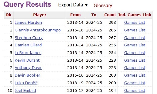 據統(tǒng)計,哈登是2014年以來,聯盟中砍下30+場次數最多的球員,算上今天已有294場。字母哥、庫里分列2、3位。