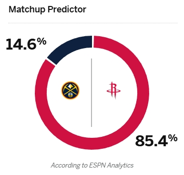 賽前ESPN給出了兩隊(duì)本場(chǎng)比賽的勝率:火箭85.4%、掘金14.6%。
