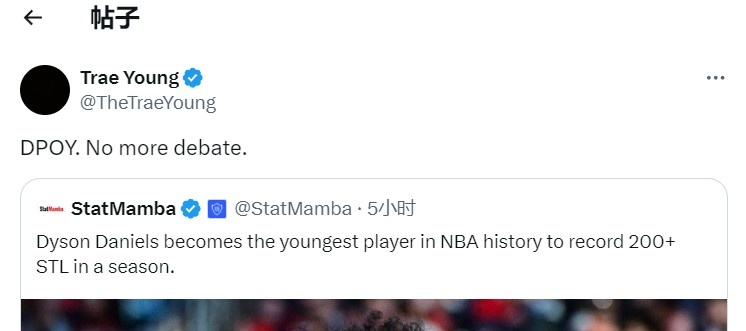 比賽結(jié)束后,老鷹球星特雷-楊轉(zhuǎn)發(fā)了丹尼爾斯的這一數(shù)據(jù),并在旁邊寫(xiě)道:“年度最佳防守球員。停止?fàn)幷摗!?/p>