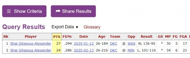根據(jù)數(shù)據(jù)統(tǒng)計(jì),亞歷山大今天的命中率(24.1%)是賽季至今的最低,本場比賽之前,SGA有過兩場命中率低于3成的比賽,一場是對陣奇才17中5(29.4%),一場是對陣森林狼21中6(28.6%)。