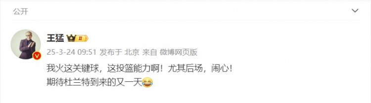 王猛在個人微博上寫道:“我火這關(guān)鍵球,這投籃能力?。∮绕浜髨?,鬧心!