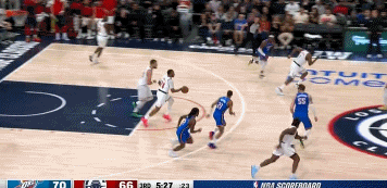迎著拋投王!本-西蒙斯快下接球面對哈滕拋投打進