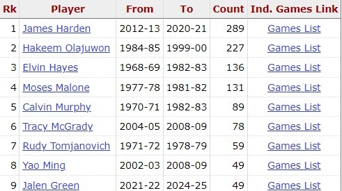 據(jù)統(tǒng)計(jì),這是杰倫-格林生涯第50場(chǎng)比賽30+,超越姚明,獨(dú)享隊(duì)史第8位。