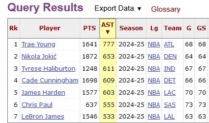 本場(chǎng)過(guò)后,特雷-楊本賽季助攻數(shù)逼近800,來(lái)到796。他也高居賽季助攻榜首位,比第2名約基奇多了143個(gè)!榜單前7名如下: