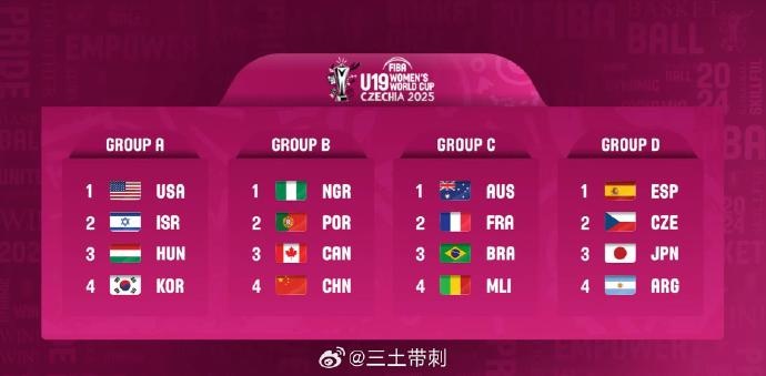 2月4日訊 2025年U19女籃世界杯分組抽簽結(jié)束,中國女籃分到了B組,同組的有尼日利亞、葡萄牙、加拿大。具體分組如下: