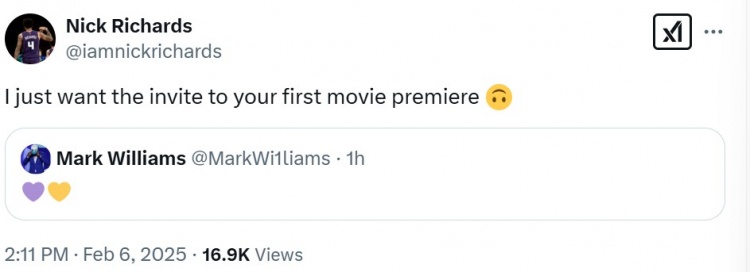 前隊(duì)友尼克-理查茲評(píng)論道:“我只想要你在湖人首秀的邀請(qǐng)。”