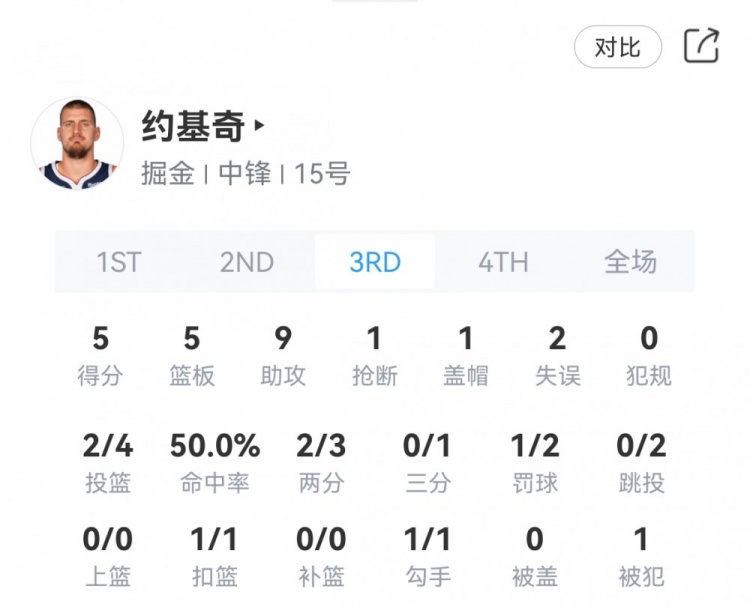 第三節(jié),掘金核心約基奇穿針引線,單節(jié)送出9次助攻,三節(jié)打完約基奇砍下28分10籃板12助攻2搶斷。
