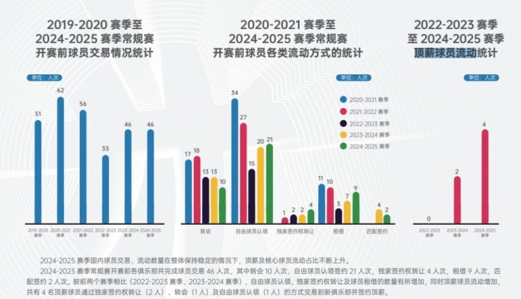 2024-2025賽季國(guó)內(nèi)球員交易、流動(dòng)數(shù)量在整體保持穩(wěn)定的情況下,頂薪及核心球員流動(dòng)占比不斷上升。