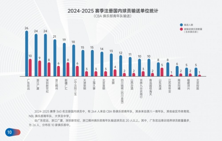 2024-2025賽季 360 名注冊(cè)國(guó)內(nèi)球員中,有264人來(lái)自CBA各俱樂(lè)部青年隊(duì),其余來(lái)自原八一青年隊(duì)、其他省區(qū)市體育局、NBL俱樂(lè)部青年隊(duì)、大學(xué)及中學(xué)。